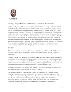The document “Toward a Social Ethos of the Orthodox Church” was released by the Ecumenical Patriarchate. It was prepared by a specially appointed commission of theologians to address contemporary social issues in light of the “social doctrine of the Orthodox Church, as [it] has been reflected and expressed in the tradition through the centuries…” Among its conclusions, the commission emphasized, “The Church must also remain attentive to the promptings of the Spirit in regard to the ministry of women… the Church must continue to consider how women can best participate in building up the body of Christ, including a renewal of the order of the female diaconate for today.”